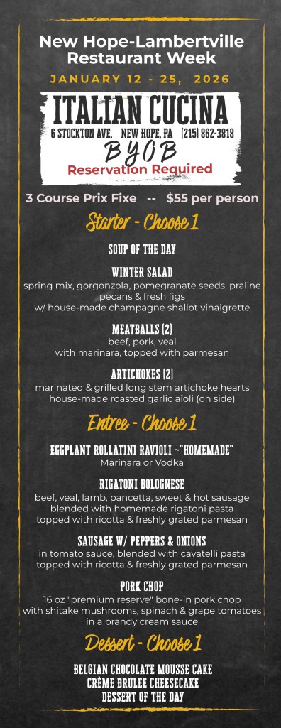 Call or email today for reservations.(215) 862-3818 // italiancucinanewhope@gmail.com